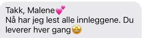 Samarbeidet med Malene har vært veldig fint, behagelig og fruktbart. Jeg har fått en sparringspartner som hjelper meg videre i jobben med sosiale medier. Vi har fått ryddet opp i profilen min og laget et tydeligere design - og mer variasjon mellom Reels og karusellposter. I tillegg har jeg fått en mye bedre struktur og har vel aldri vært så forberedt med innlegg i måneden som kommer enn nå. Før gikk det mest fra dag til dag og det var ganske utmattende. Jeg har gått fra uregelmessighet og få innlegg men med stress - til mange flere og bedre innlegg med større ro. Malene er både kreativ og effektiv. Jeg merker at jeg har lært masse i prosessen og også er i stand til å produsere mer effektive og nyttige innlegg på egenhånd og med større letthet etter å ha jobbet med Malene en stund. Anbefales på det varmeste.