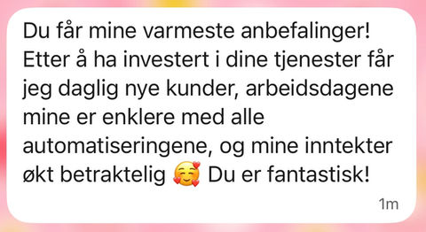 Jeg valgte å jobbe med Malene fordi jeg trengte hjelp med å administrere min Instagram-konto. Jeg ønsket å kunne fokusere mer på mine kunder, og Instagram hadde blitt en belastning som stadig hang over meg. Malene kom sterkt anbefalt av en person jeg stolte på, og det har jeg ikke angret på. Hun har gjort min hverdag enklere, fått min Instagram-konto til å se mer profesjonell ut, og hjulpet meg med å øke følgerantallet ved å lage bedre innhold. Hvis du leter etter en hardtarbeidende, dedikert hjelper til din Instagram-konto, kan jeg trygt si at du ikke vil angre på å velge Malene.